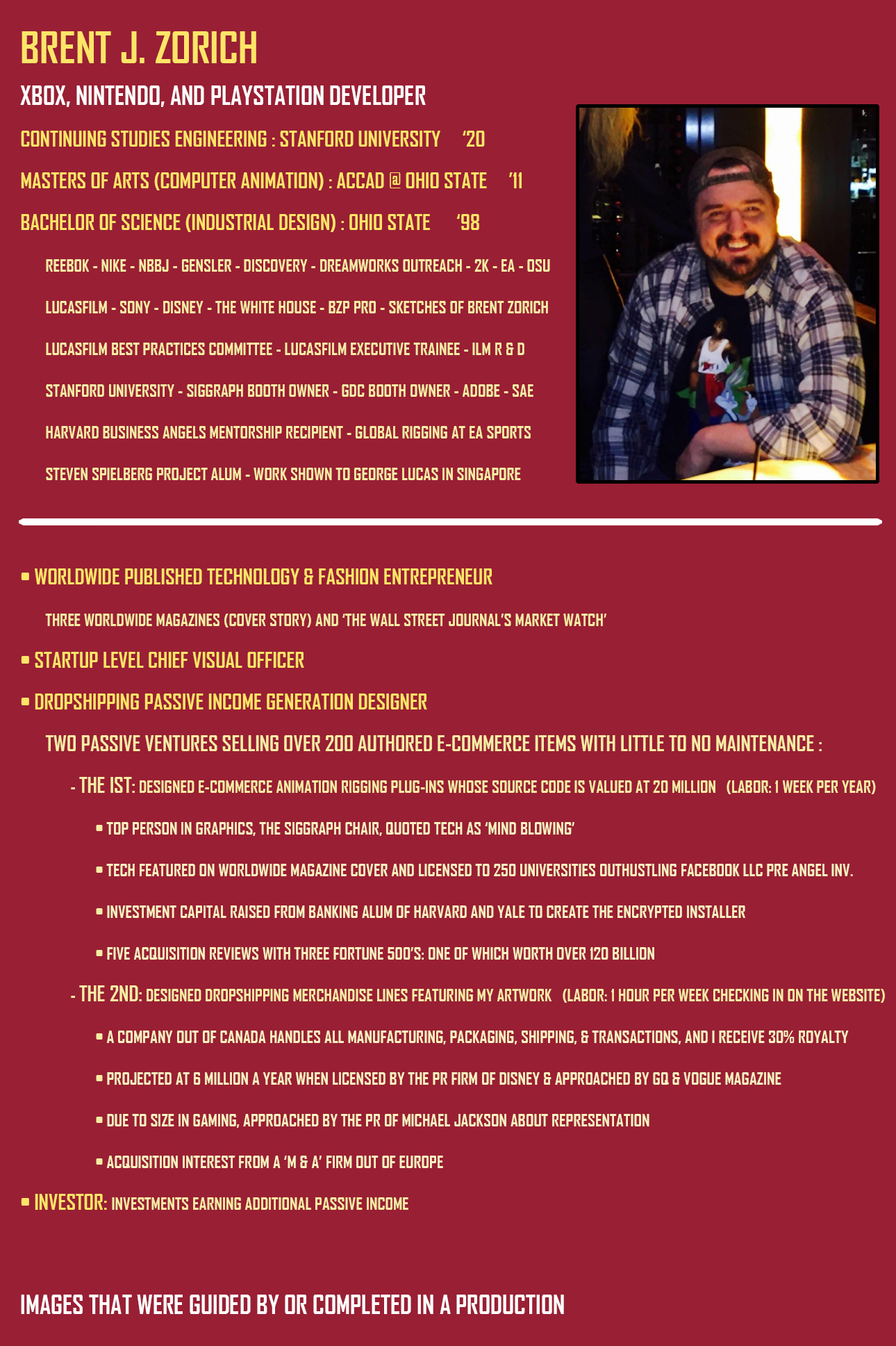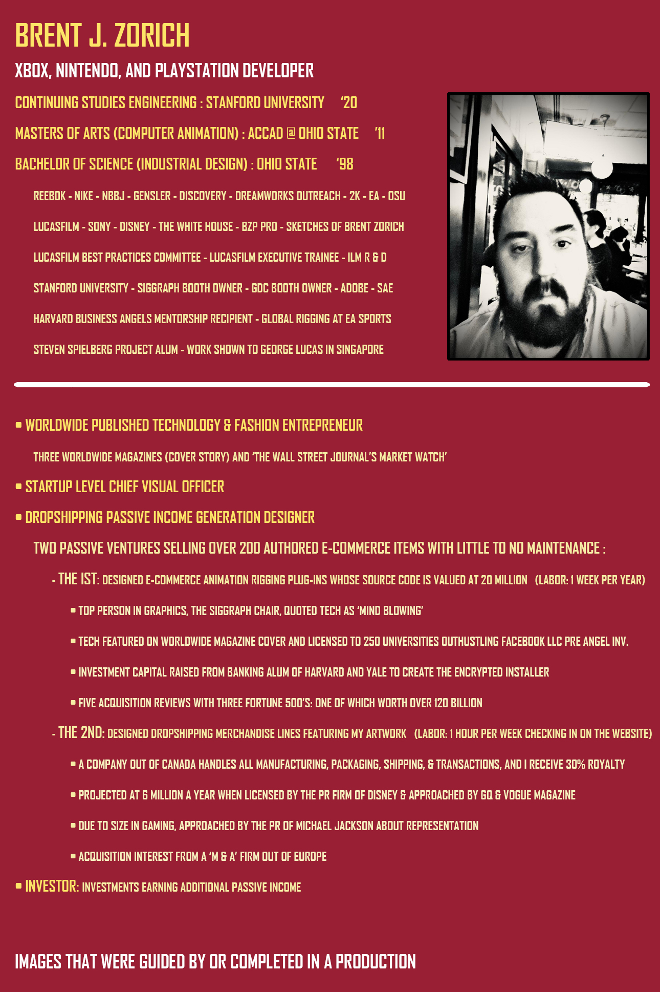Brent’s eventual goal would to be a Chief Visual Officer at a major animation, visual effects, or video game studio similar to someone like Doug Chiang, Hideo Kojima, or John Knoll, with Mark Pincus potential: who he had the pleasure of having a brainstorming session. Companies he had in mind were PlayStation (God of War, Drake’s Uncharted Fortune, Last of Us, Spider-Man), Xbox (Halo), Rockstar Games (Grand Theft Auto), Warner Bros Interactive (Harry Potter, Batman, The Lord of the Rings), a return to ILM (Star Wars, Marvel), and a return to Electronic Arts (Star Wars). He looks to the creative visual guidance of Peter Jackson and JK Rowling work for inspiration. Brent hopes to write a [ MEMOIR ] one day on his own reflections and professional practices stemming from portfolio experiences as well as collegiate lecturing similar to architect Simon Wyler in the movie “The Lake House”- as a goal Brent would hope that every three years for three months he could take a sabbatical and lecture a studio class at Harvard University in Design, Animation, or Engineering. Brent is hopeful that once one of his ventures are acquired, and the money is invested properly, he will have the resources to operate his own private equity firm that will coincide with Chief Visual Officer tasks.